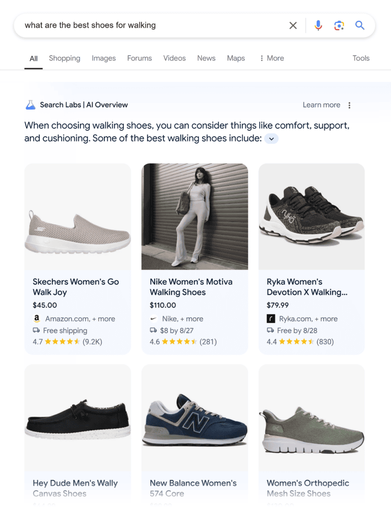 هنگام استفاده از موتور جستجوي گوگل، احتمالاً هنوز به نتايج AI Overviews برخورد نكرده‌ايد زيرا اين قابليت فقط در آمريكا و چند كشور ديگر از جمله هند، ژاپن و غيره ارائه مي‌شود و تا آخر سال در ساير كشورها نيز پياده‌سازي خواهد كرد. در حال حاضر، موتور جستجوي گوگل، ليستي از وب‌سايت‌ها را به كاربرانش نشان مي‌دهد كه كاربر بايد روي اين ليست‌ها كليك كند و به سايت مورد نظر خودش برسد. با استفاده از AI Overviews، در نتايج جستجوي گوگل، محتوايي توسط هوش مصنوعي توليد مي‌شود و به كاربران نشان داده مي‌شود. در شكل زير مثالي از نتيجه جستجوي كليد واژه “بهترين كفش براي پياده‌روي” با استفاده از AI Overviews را مشاهده مي‌كنيد.